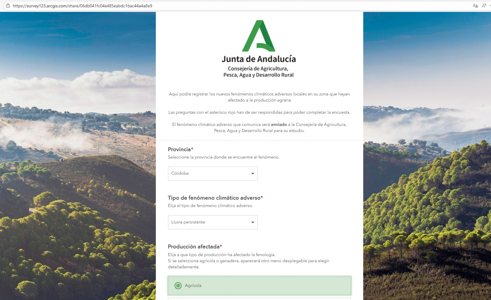 • Un formulario donde cualquier ciudadano (independientemente de que sea agricultor o ganadero) podrá registrar nuevos fenómenos climáticos adversos locales que se produzcan en el entorno donde se encuentre. El formulario se puede visualizar tanto desde un ordenador como desde el móvil y consta de una serie de campos que son obligatorios y están marcados con asterisco siendo los siguientes (provincia, tipo de fenómeno, localización, fecha y hora en que se produce) además tiene otros campos que son opcionales, entre ellos permite subir fotografías. El formulario es público y se puede visualizar en el siguiente enlace: